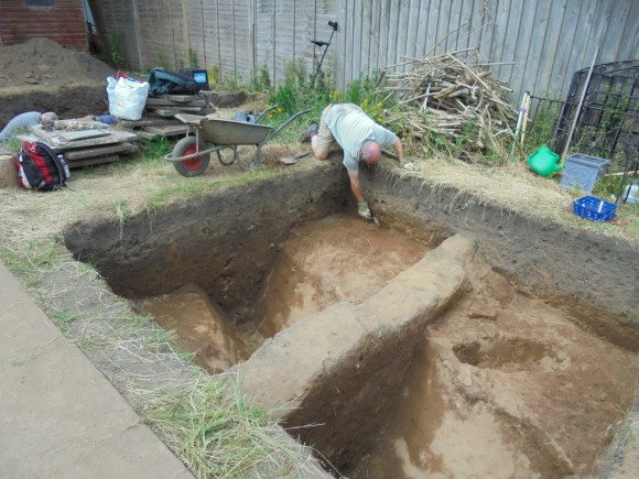 Through the generosity of the owners the rear garden of 14 Booth Place (NS 8874 7973) was made available for archaeological exploration and an excavation took place over the period of 26 June to 10 July 2021. Five trenches were dug by hand and numbered T1-T5 in the order in which they were commenced. Features within each trench were allocated an individual F number, so, for example, F7 was a ditch. For the purposes of description in what follows site north is aligned with the garden.