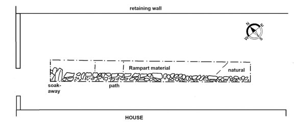 The southern side of the Rampart occurred in Trench 1 but the northern side was not found. The turfy material in Trench 2 may have been derived from the demolition or collapse of the Rampart, but its absence from the eastern side of that trench suggests that it may have been just beyond the line, as shown on the map above. The line of the wall does not follow the strike of the hill but runs across it at an angle to lessen the gradient. The section of the turfwork excavated suggests that it was terraced into the lateral slope, and it was also noticeable that the natural in trench 2 was relatively flat despite being considerably lower than that in Trench 1.