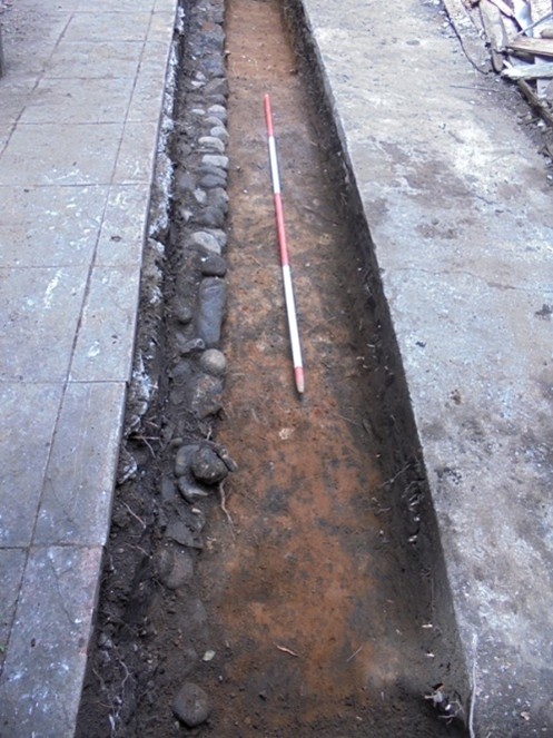Trench 1 was 6.7m long but only 0.7m wide and was placed 0.9m to the east of the east gable of 109 Cockburn Street. Its size and location was determined by the presence of a cast concrete floor and paving slabs (as can be seen on the photographs). Fortunately the modern deposits proved to be shallow and a cobble path occurred at a depth of 0.25-0.3m below the concrete. It ran parallel with the house with which it was intimately associated and extended 0.2-0.3m into the trench. The southern 3m (F4) consisted of small round cobbles with those along the eastern edge neatly aligned to form a kerb. The northern section (F5) of the path was composed of flat broken sandstone, also with a kerb. Over both sections was a thick layer of ash and clinker. The single layer of cobble stones had been laid on buff clay loam (F6) which contained some charcoal flecks and 18-19th century pottery. F6 was only 0.2m deep at the southern end of the trench but this increased to 0.45 at the northern end. Below it was an orange-brown sandy loam (F7) containing tobacco pipe stems and a few pieces of green-glazed ware. This was clearly a cultivation soil which followed the slope of the hill – its base was 0.25m below the concrete near the southern end of the trench and 0.78m at the north end.
