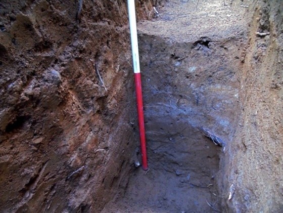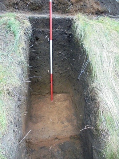 F7 gave way to a bright orange sandy loam natural in the first metre of the trench, but the remainder consisted of patchy yellow, brown-orange, and grey/blue clay and clay loam (F8) representing laid turfwork. A modern disturbance was exploited to place a section through this layer which proved to be 0.43m deep at that point. At its base was the same natural as found at the south end of the trench.