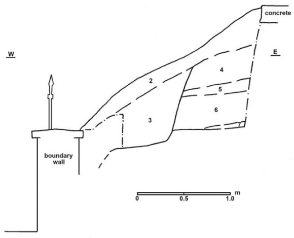 Trench 2 was excavated on the steep grassy slope between the house and Cockburn Street. This is a confined space but it was useful in determining the natural hill slope before modern terracing took place. The natural orange silty sand was discovered at the base of the trench some 1.32m below the level of the concrete at Trench 1, i.e. 0.52 below its level at the north end of Trench 1 just 2.6m to the south. On this, in the south-west corner of the trench, was a thin layer of patchy yellow and orange clay (layer 7 in the section) which may represent turf collapsed from the Rampart. Above this the thick layers were all associated with the post-medieval cultivation of the area.