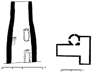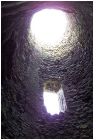 The round tower of the windmill is 6m in external diameter at the base but tapers upwards to a little over 4m at a height of 12.6m, with stone rubble walls 0.6-1.0m thick. The quoins of the doors are of large freestone with stone lintels. It had three floors plus the cap-house. Doorways on the ground floor in the south and east walls gave direct communication with the barn. There was also an external door in the west wall, and a small window in the north wall. This room was 3.8m high and in the room above there was another small window in the north wall. The second floor was set at a height of 4.9m above the ground. At this level a tall doorway on the west side gave access to an external balcony, still evidenced by the beam slots or putlog holes. It is at approximately this level that the tower tapers at its greatest and this platform was evidently used to trim the sails which cleared the building as a result of the intake. The cloth that had formerly been spread over the lattice frame of the sail was known as reef and this then became the reefing balcony, now used to tension the springs of the wooden paddles. The next floor was 2.2m further up.