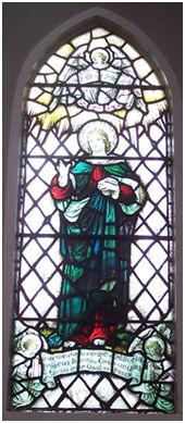 (10) (below left) A bare-footed woman, identified in the ribbon above as Mary, stands facing the viewer. She wears a white robe, covered by a blue cloak and pale pink head scarf. Her arms are brought together over her chest and clasp a book. Behind her are a well, trees and flowers. This foliage extends to the top of the window where a winged soul peeps out. The panel at the bottom reads “To the Glory of GOD and in Loving memory of/ Catherine Hamilton Stevens Johnston/ Who died April 8th 1926/ Erected by her Husband and Family”.