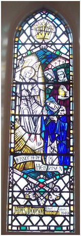 (20) A modern, stylistic, window with a broad fleur-de-lis studded border to the lancet shape containing three roundels. The uppermost houses a bird – its wings outstretched and diving downwards; the central roundel shows a herald of death with his trumpet hovering over a shadowy landscape, presumably Calvary Hill; the lowest has a burning bush. The outer border of the central roundel has a Latin inscription “IN TERRA PAX MINIBUS BONAE VOLU-NTATIS”.