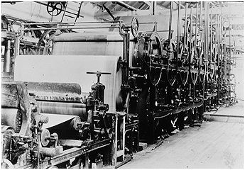Originally the paper had been made by hand with few mechanical devices and hence a low output. In the nineteenth century this rapidly changed. Engineers and boilermen were just as essential as papermakers in the industry. Manual labour was still needed for much of the process and large numbers of women were employed to perform the routine tasks. A description of the papermaking process at Herbertshire Mill in 1858 gives a good idea of this mix of hand and mechanical work as well as the conditions under which it was performed: