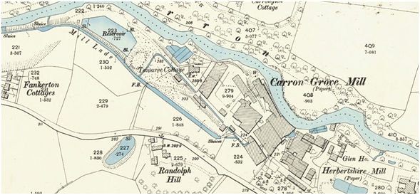 The precise date of the establishment of Carron Grove Paper Mill is not known. A Carron watermark found in white wove foolscap printing paper in 1819 is ascribed to Thomas Burns at the mill and by then it employed 25 people making a coarse paper board from old tarred rope (Inveresk plc 13, 28). The mill was built between the Herbertshire Paper Mill and Tamaree Meal Mill, making use of the same water lade. This necessitated agreements to safeguard the water supply to the former – both as regards quantity and quality.