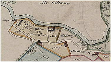 “The mill, which contains two engines, with very complete and substantial machinery, utensils, etc and the Dwelling House, Offices and Work-Houses, etc were all erected and complete within these few years, in a substantial manner at the expense on the whole of upwards of L.2000 Sterling and of course are at present in the best order and repair, so that there is little occasion for immediate outlay, and a capital to carry on the manufactory is only required. The situation is known to be advantageous for the purchase of rags etc., the profits on the manufacture are very considerable, the demands for produce great, with quick returns, and the rent expected is moderate.