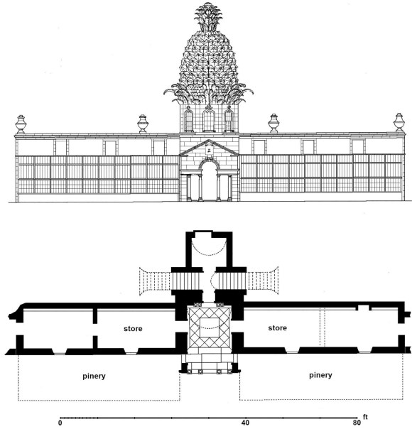 The variety of pineapple used as the model was evidently the cultivar ‘Jamaica Queen,’ a variety with fiercely spiny leaves, outward projecting fruitlets and a perfectly egg-shaped outline tapering more towards the top. It stands about 37ft (11.3m) above the level of its threshold on the north; and, including the height of the portico, at least 54ft (16.5m) above that of the garden on the south.