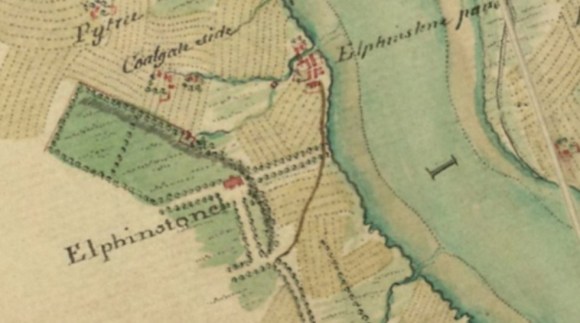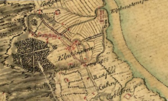 When John Murray bought the Elphinstone estate in 1754 the surroundings were very different from what they are now and we are fortunate that this was at just the time that William Roy and his team were surveying Scotland for the Great Map. The principal residence was at Elphinstone Tower. Despite being referred to as a tower it was in fact a substantial mansion. The tower had been built at the beginning of the 16th century but it had a later large three-storey stone wing on its west side and a smaller one to the south.