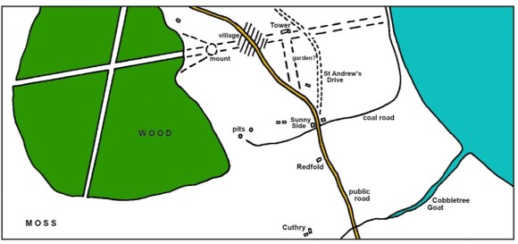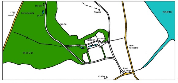 The public road southwards from the village to the burgh of Airth met the South Avenue at a place called Sunny Side (which became the site of the Pineapple), before going on to Redfold and Cuthry (basically on the drive to the present East Lodge). Roy’s Highland map shows the policy of the house in green with arable land to the north and east, and Dunmore Wood to the west. To the south and south-west was the old common (hence the name Cuthrie) and moss. The policy would have taken the form of old pasture and this early designed landscape would have given the surrounds of the house a pleasant parkland feel.
