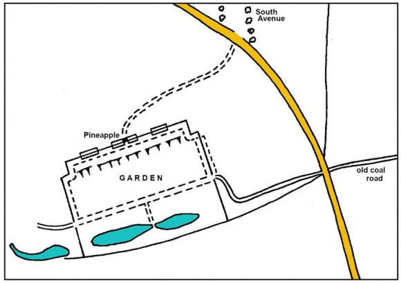 The walled gardens were installed in open ground on a south-facing slope and hence the previous name of Sunny Side. Two old coal shafts are known in the area – one near the west wall of the main walled garden, and one 100yds to the west.