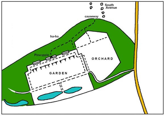The old South Avenue pointed to where the eastern compartment of the walled garden now stands. That compartment is clearly later than the main walled garden (as shown by the butt join of their walls) and appears to have been fitted out as an orchard and therefore provided a buffer between the road and the pleasure garden proper. It may have been built after the Earl’s return from Virginia (he had been governor of New York 1769-1770 and Virginia 1771-1776). The field to the north of the Pineapple is surrounded by a ha-ha showing that it was still parkland, with provision for a shelter belt between it and the walled gardens. The ditch of the ha-ha has a causeway across it on the line of the South Avenue, thus privately linking the walled garden directly to Dunmore Tower. The area to the north of the walled garden was planted as a shrubbery, and species of yew, ash and rhododendron remain today, but are overgrown and have obscured the views out to the north and east.
