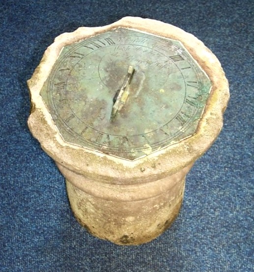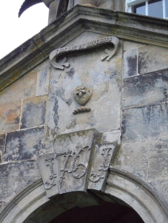 In 1803 George, 5th Earl of Dunmore, had married Susan, daughter of the 9th Duke of Hamilton. The massive armorial panel over the main entrance to the new house gives the Murray of Dunmore coat-of-arms parted per pale with those of Hamilton, but the datestone above the door on the side of the house has the emblems of Hamilton. The latter opened up onto the flower garden designed by the Countess of Pembroke. The Hamilton motifs were also set into the armorial panel at the Pineapple. These were a heart charged with a cinquefoil and the motto FIDELIS IN ADVERSIS (“Faithful in adversity”). First the existing decoration was chiselled flat with the face of the stone and then the new devices were pinned to it. Effacing his family crest would seem like a strange thing for the 5th Earl to have done after he inherited the estate from his father in 1809 and so it is possible that this event took place after 1892 when the property was acquired by Claud Hamilton. However, the bronze dial of the sundial near the pond also dates to this earlier period. It was made by John Russell who was one of Falkirk’s most famous watch and clock makers. The dial is inscribed “J Rufsell, Falkirk/ Watchmaker to H.R.H./ The Prince of Wales”. He had been appointed as Watchmaker to the Prince of Wales in 1811 and died in September 1817.
