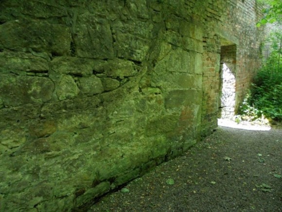 The north wall of the walled garden was complex. In the centre was the summerhouse, 15ft (4.6m) wide, flanked by the gardeners’ houses, stores and pineries – 45ft long (13.7m). To either side of these were 60ft (18.3m) long sections of heated brick walls. Beyond these are 68ft of deeply recessed walls, and finally another 68ft (20.7m) of end walls on the main line. It will be noted that the sections increase in length to either end to compensate for visual attenuation when viewed from the centre. The heated sections were 11ft (3.4m) tall, capped with sandstone slabs. No structures are shown in front of these walls on the 1860 Ordnance Survey map but they were fronted by greenhouses by the time of the 1895 edition. They are of double construction and contain cavities through which hot air was circulated for the benefit of the espaniolated fruit-trees.