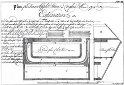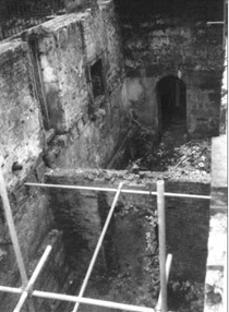 The wall is here 3ft 3in (1.0m) thick and steps on the north side lead down to two furnace chambers beside which are small vaulted spaces for storing the fuel. The recessed sections of the north wall are taller and are set about 5ft (1.5m) back. They are not double; they were evidently designed to house greenhouses. The raggle of the south-facing roofs can still be made out on the return walls. The additional height suggests that they served as vineries and orangeries. Originally the walls to the west and east of the gardeners’ dwellings were only about 11ft (3.4m) tall, level with the string course of the central block. They were soon raised in height by a further 4ft (1,2m). The sections of heated walls have three rectangular recessed alcoves towards the top which may have been to take bee skeps in the summer. Alternating rectangular and square openings close to the tops of the recessed wall sections may, on the other hand, have been for ventilation of the glass houses.