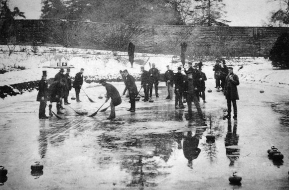 “It is under the hot frames of course where anything worth seeing is to be seen. The first is devoted to the rearing of young vines. The system adopted by Mr Carmichael for the better production of the crop is by planting the muscat of Alexandria and the Black Hamburgh alternatively. A richer profusion of fruit could not be desired, and the enterprising superintendent has evidently a special genius for this profession. The Stirling Castle peach, which is grown in an adjoining house, is beautifully trained, and Mr Carmichael, we understand, was the first last season who had the peach in the London market. Among the flowers under glass are heaths, camellias, geraniums, and fuschias, and of rarer kinds we may note the “holy ghost” plant, or, as it is classically named, the Peristeria elata, and the Begonia Rex. We had also the pleasure of seeing and tasting the new fruit Eugenia Ugni. The berry is of a reddish hue, about the size of a black current, and has the flavour of the strawberry. It only required the protection of a cool greenhouse, and the plant generally is not unlike the myrtle. The “laying out” of the kitchen garden is a masterpiece of order. Its extent may be 10½ acres, and the ground is bounded on the south by what is reserved as a curling pond. If this severe and congelating weather continues, there will be a few roaring games played by the bye. Somehow we have a particular liking for the echoing music of the ice, as the curling stone bounds along its glassy surface, and for us there is a practical poetry in the artistic sweep of the broom” (Falkirk Herald 27 October 1859, 3).