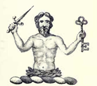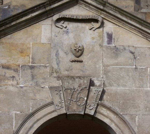 Above the datestone is an armorial panel which bears carvings that can be dated to shortly after 1803 (see below). This panel has been described as “later and clumsier” than the original design and yet its position in the pediment of the porch would seem to demand a coat-of-arms to fill it. And such was the case, for, by close examination, we can see that they were placed over an earlier carving which properly filled the space available. The original sculpture consisted of a demi-savage, wreathed about the head and loins with oak, holding in the dexter hand a sword erect Proper, pommel and hilt Or, and in the sinister a key of the Last. Above this is a slender earl’s coronet. These are the emblems of the Murrays of Dunmore.