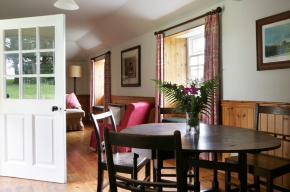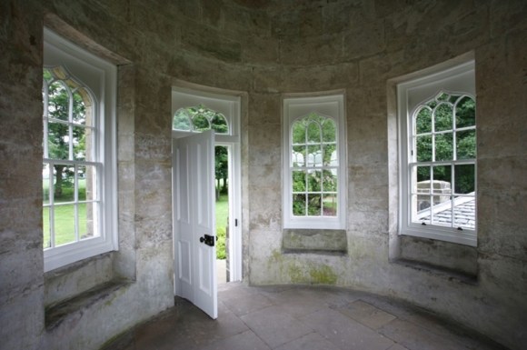 The site had been severely neglected and the buildings on either side of the Pineapple were deteriorating in a bad way and overgrown. The vegetation had to be removed. The three remaining urn-shaped chimney pots were taken down and all of the doors, window frames and the carved wood entablature behind the portico were removed and stored for later use. New joists and flooring were put in and the roofs were rebuilt and recovered using the best of the old slates with new ones to match. All of the timber lintels were replaced and the walls were made good up to the eaves with the coping stones carefully reset. The fourth decorative chimney pot was found broken into many fragments, but these were all carefully gathered and stuck back together to join the other three. The portico roof was likewise re-slated with a mix of old and new slates and the cornice was carefully taken down, re-bedded and reset because it had become displaced. Stonework to the north entrance and the steps was reset and the metal railings repaired and re-fixed. The walls and vault were treated for damp and waterproofed and re-plastered. The wooden Ionic columns and the broken entablature were restored and the stone slab floor was overhauled with paving from Natural Stone Quarries(UK) Ltd. Amazingly, the stonework of the Pineapple was in remarkably good condition – all the joints were raked out and re-pointed and the whole fruit was cleaned by hand with just water and a churn brush. Inside, the existing windows were repaired and others were replaced to match exactly. The stonework and plasterwork was cleaned and redecorated and window seats were supplied and fitted. Finally the holiday accommodation was formed in the two wings – bedrooms, bathroom, sitting room and kitchen.