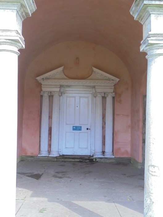 Visitors who step through this archway into the barrel-vaulted vestibule face an elaborately framed doorway, flanked, on either side, by pairs of painted wooden Ionic columns, carved with great care, which display perfect fluting and entasis. The columns support a full entablature with a broken pediment. Lateral openings in the loggia – that part of the portico which protrudes from the garden wall – once led into the hot-houses. Doors in the side walls of the chamber give access to storage rooms hidden behind the garden wall. As the ground rises steeply to the north, the door at the inner end of the vestibule is consequently at basement level. Beyond the door a small vaulted chamber houses flights of steps which rise to right and left to the upper level. This part of the basement is bridged by a broad platform, flanked by heavy iron railings, which leads to the door of the summer house proper.
