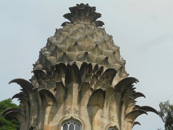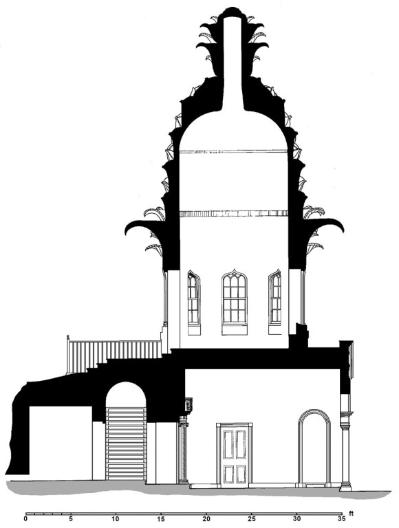 This upper pavilion approaches the octagonal in plan but its sides are slightly curved. At each external angle there is a thick stem-like column, and in seven sides an ogival-headed window, with a door in the eighth. Within there is a circular chamber. Even the door and the panes of glass in the sash windows are curved, so as to match the curve of the walls in the room, which is just large enough to house a round table and some chairs. This chamber has a domical ceiling of stone, in the centre of which a circular funnel rises to the full height of the building. There may originally have been an upper floor or gallery, as joist-holes can be seen at a height of 14ft 6in (4.4m) above floor level. The outside of the dome or cupola takes the realistic form of a pineapple. The gothic ogee-arched windows terminate cleverly into the midrib of the leaves that curve outward in beautiful arches four feet wide. To either side the miniature engaged columns clasping the angles of the octagonal summerhouse behave in a similar fashion, creating an arched canopy around the window-heads. The massive leaves and fruits are cantilevered out from the carefully executed coursed masonry. The base of each leaf is higher than it appears when viewed from below, so that the rain water drains away easily from these higher parts to prevent frost damage. The stiff serrated edges of the lowest and topmost leaves and the plum berry-like fruits are all cunningly graded so that water cannot accumulate behind them. The structure is completed with a spiny-leafed crown.