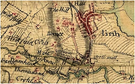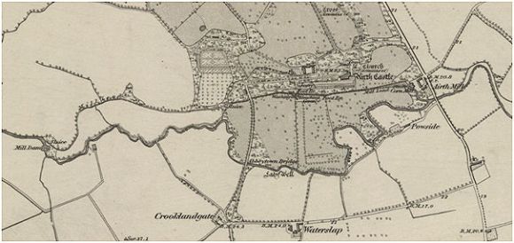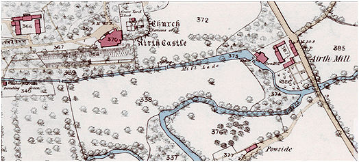In the early 18th century the mill lade south of Airth Castle was incorporated into the designed landscape of that country seat. Several plans were drawn up for the gardens and all of them included water features in the form of ornately edged ponds. To the west of this formal element an estate wash-house and bleaching green used its waters.