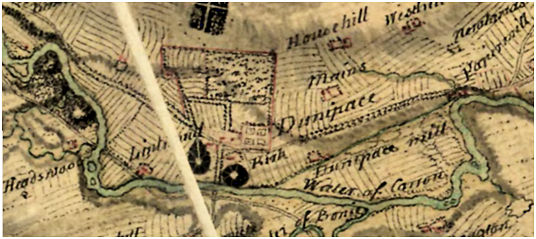 Just a few years later, in 1759, the Carron Company was established and in December that year leased the Old Mill from McKell (Watters 2010, 12). Water power was to be vital for the new iron foundry and the mill was to be used for grinding. Just as importantly, it appears that the original intention had been to divert the waters of the River Carron to the new works at Stenhouse using the weir for Dunipace Mill as the starting point. The water would have run on to the papermill and thence slightly further north than the lade actually constructed from near Larbert Church. An old marle pit just to the east of Dunipace Mill would have made a convenient reservoir and plans were laid for diverting the Bonny Water so that it would enter the Carron upstream of the existing weir. A plan showing Carron Company’s mills (RHP 1497) indicates some of these arrangements and shows that Dunipace Mill consisted of four buildings. However, the owner of Dunipace Mill, Mr Spottiswood, demanded too high a lease and that part of the plan was abandoned. Dry summers leading to an inability to work the foundry encouraged Carron Company to return to the idea of storing water at Dunipace to even out the supply. However, their new reservoir strayed too far to the south and it turned out that that area belonged not to Dunipace Estate but to Callendar Estate and had been cut off when the river had changed course centuries before. The new owner of Callendar from 1783 was William Forbes and he was not slow in taking action against the Company.
