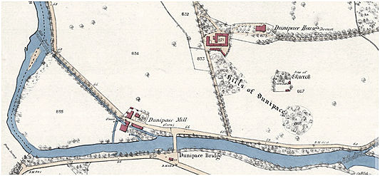 The old baronial mill of Dunipace lay to the east of the Hills of Dunipace. The weir across the River Carron diverted water along the contour later followed by the public road (the B905) and on to Larbert Waugh Mill in the neighbouring parish of Guildfield. Just beyond the point where the lade was joined by a small stream from the north stood the ancient mill. It is first mentioned in the Cambuskenneth Cartularies in 1200