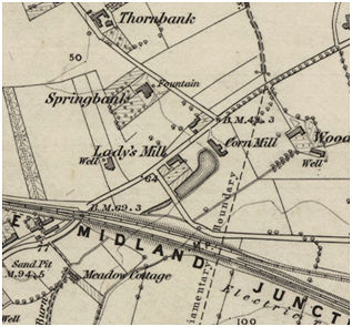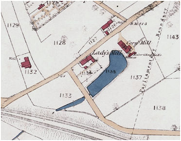 By this time Lady’s Mill was a large building used as a meal and flour mill, with a storehouse for grain in the northern portion. The bulk of the mill was of two storeys with a wing on the north side for the kiln. The working part of the mill occupied the southern end of the building and here a large new wheel was installed and the gearing upgraded. The northern end of the main building was used as a grain store. The store held processed materials belonging to tradesmen in the town such as the bakers, farmers and flour merchants. Separate and to the south of this was the boiler and engine house.