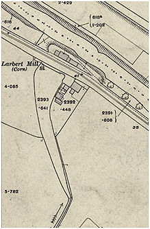 Larbert Mill stands on the north side of Stirling Road on the south bank of the River Carron. Despite its location it does not use the water from the river to provide the power. Rather, it utilised the water from the Lightwater Burn which comes from Tamfourhill. This water was stored in a mill pond on the south side of Stirling Road and it was the drop from there to the river which provided the gravitational energy.