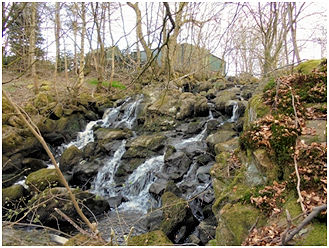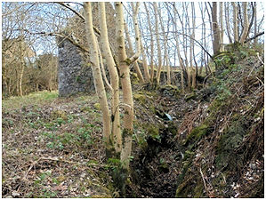 The original mill lay immediately to the west of the linn at the foot of a large ridge of rock over which the burn cascades. Cutting channels in this whinstone is no easy task and they follow natural fissures which have been artificially widened. We can therefore be pretty sure that the mill dam and lades were little changed over the years. The mill pond lay on the top of the ridge to the west of the stream.