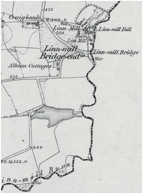 The name of this mill derives from a waterfall immediately to the east of the buildings described in 1860 as “a very beautiful waterfall, upwards of 60 feet” (Ordnance Survey Name Book), though it has since lost some of its former glory. The stream itself is also named after this linn – the Linnmill Burn which continues north to the River Avon and forms the boundary between Stirlingshire and Linlithgowshire. Linn Mill Bridge on the road from Avonbridge to Strath is likewise so named and from this we get Linnmill Bridge-End for the nearby cottages. Linnmill Brae is the name of the road from there to Avonbridge. Yet the stream has an older name – the Polness Burn, meaning “burn of the waterfall.” (Reid 2009 170).