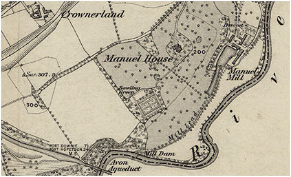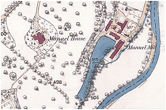 The first edition Ordnance Survey map of 1859 shows the building complex at Manuel Mill almost at its full extent and the Ordnance Survey Name Book describes it as: