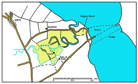 There are few suitable locations for a water mill in the main area of Elphinston but the Halls of Airth, lying on the south side of Airth Pow, were part of the barony and so it is probable that the mill lay in that vicinity. The charter for Airth Mill in 1618 mentions two other mills further down the Pow – referred to as Patrick Higgin’s old mill and Patrick Higgin’s new mill. The family’s landholdings lay on the north side of the Pow within the Barony of Airth and two mills are associated with these – one immediately to the north of Neuk House (the Nether Mill of Airth), and the other further to the east. It has been natural to assume that the latter was what became known as New Mill or Newmills at Higgin’s Neuk at the ferry crossing to Kincardine. However, it actually stood on the east side of the Pow and therefore outwith the land belonging to Patrick Higgins but within the Barony of Elphinston.
