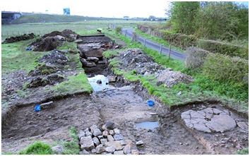 The mill used the water from the Pow Burn, diverting it into the Forth at the tip of a meander which approached within 50m of the old shoreline. This was 1.1km from its mouth but here the land is relatively flat and the mill was probably only operational at low tide. A weir must have been placed across the Pow for this purpose, still allowing surplus water to continue its normal journey. The channel or cut across the 50m strip was partially examined in the 2016 archaeological excavation and was found to be 8.5m wide and initially had gently sloping sides. This would be at odds with its construction as part of the mill which should have been much narrower with steep sides and may hint that it was originally cut to scour the silt away from the east side of the stone pier. A sluice under the modern road would have been sufficient for that purpose. The adoption of the channel for the mill took the form of stone walls reducing the width to 4.5m at the point of examination. The channel and hence the water wheel was located at the east gable of the mill and there was evidence for superior quality masonry in the lower courses of this wall.