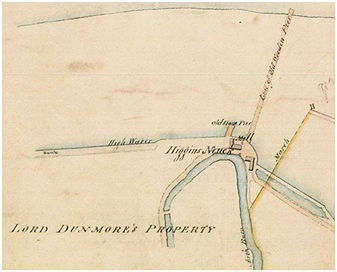 Silting at the new pier was causing concern and so in 1786 Lord Dunmore explored the possibility of diverting the Pow Burn into the Forth at this point to increase the scouring action. The bridge over the Pow at Newmilns required reconstruction and so he proposed to construct a damhead across the stream to carry the new road. This would have rendered the New Mill Pool (ie the Pow north of the old bridge) useless as a harbour and so he offered to excambion land with Graham of Airth so that he could still have a shipping place for coal, lime and such forth (NLS ms10877, 6). The requirements for access and future navigation made this unworkable (NLS ms10877, 11) and in 1788 a new bridge was built by Charles Stuart on the site of the old one. Nevertheless, the damhead was constructed and the meander of Higgins Neuk was cut across. This effectively turned the entire meander into a mill pond for the New Mill, increasing its ability to remove the mud from the ferry pier.