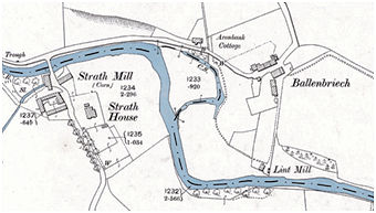 Strath Mill was a corn mill just 250m to the west and sat high up on the south bank of the River Avon meaning that its operation was not impacted by this rise in river level. The lint mill was also known as the East Mill of Ballenbreich to distinguish it from Waugh’s Mill at Avonbridge. It appears as Ballenbreich Lint Mill on the Valuation of the Parish in the Muiravonside Kirk Session records. The Ordnance Survey Name Book of the 1860s describes Ballenbriech as :