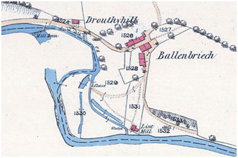 The map shows a complex series of lint ponds and sluices on the low ground beside the river to the west of the mill building. These would have been used to steep the flax before treatment and had mostly disappeared before the 1897 map was surveyed.