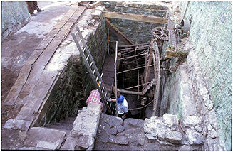 The wheel was of 16ft diameter; the outer circumference made up of cast iron panels bolted together. Slots on the inside of the panels took the timber paddles, strengthened by steel tie-bars. The axle sat in cast iron bushes with that on the west resting on an inspection path accessed by a steep stone stair. The pit had been floored over and part of the travelling saw bench sat on it. This bench continued on to the solid ground to the north. Originally it was driven directly from gearing, but latterly it was through a secondary pit to the west which housed a static circular saw.
