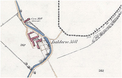 Dalderse Mill lay on flat carse lands and was powered by the East Burn of Falkirk which was joined by the Bainsford Burn a little south of the mill. The construction of the Forth & Clyde Canal reduced the effectiveness of the mill, the burn being piped under the canal. Reference to this is made in 1810: