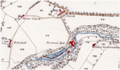 Located to the south of Garth Farm on the Castlerankine Burn, Garth Mill began life as a flax mill and is shown on an estate plan of 1793 (Reid 2004, 72). According to the Falkirk Herald it was built by the ancestors of Mrs Gillespie of Denny who died in 1948. They came from Linlithgow (Falkirk Herald 7 July 1948, 8).