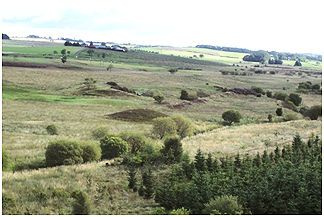 By 1860 the mill was no longer in use but two small walled enclosures, presumably associated with it, are marked as Easter Greenrig. They occupy low mounds and are too small to have been steadings. The western enclosure has two small drainage channels running towards it from the Rowantreehill Road to the north. These drains can still be seen and presumably represent roadside channels. The eastern one has a north/south path passing along its eastern side and continuing over the River Avon. It lies on the north side of the mill lade opposite to the remains of the mill. The lade is the most prominent feature of the woollen mill complex. Its southern side is formed from a large heather-covered earth mound. This becomes larger as it progresses eastward to the site of the mill. The mill is now covered with thick gorse and is cut into by large animal burrows. Some of the stone revetment on the lade is visible here, especially on the east side of the mill where the water dropped through the wheel via a sluice into the river below.