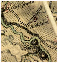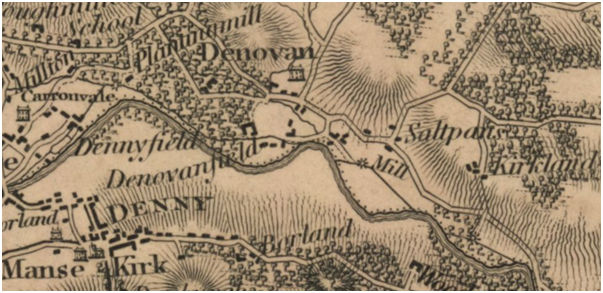 When John Livingston of Kirkland married Margaret Doig in 1621 the couple received a grant of lands which included the mill and mill lands of Kirkland. John Robertson was named as miller there in 1652. James Kirkwood was the tenant in 1787 and the last mention of the mill under this name is in 1794. The lade for the mill cut across a bend in the River Carron and is shown on Roy’s map with an unnamed building towards its eastern end.