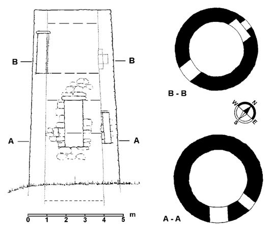 The exact date of the windmill is uncertain but an unlabelled circle on Grassam’s map of 1817 suggests that it was a little before that.  The tapering stone tower was 9.1m tall and 4.4m in diameter at the base.  The walls are 0.8m thick and despite the shrinkage of the moss the tower is still perfectly upright.  The ground level inside the tower is about 1m below that outside of it which may be a result of the manner in which it was built rather than the need for additional space inside the building.  The main door is in the south-east quadrant and is 2m off the ground level meaning that it must have been reached by wooden steps.  These steps continued inside the building and the floor was a little above the base of the doorway which consequently has no sill.  This not only kept the floor dry but meant that some of the machinery could be kept under the floor, out of the way.  Three wooden floors above this helped to brace the vertical drive shaft – the central two being very closely spaced.  The hard freestone is made of random rubble, except for the upper three layers which are coursed to take the cap.