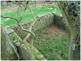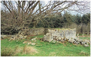 The walled enclosure measures 6.55m W/E by 6.55m N/S internally.  The walls are of quarried sandstone, 0.5m thick, capped by thin copestones.  These possess a square outer edge at the foot of a chamfer with a slight incline to the rough internal edge.  Only the southern corners have backset margins.  The interior is levelled up and the walls rise a further 1.8m.  Owing to the ground sloping down to the north, the north-east corner is 2.3m tall on the outside.  The doorway is 0.94m wide between the stobs, which are 0.15m broad and 0.4m deep.  No lintel or inscriptions were observed.
