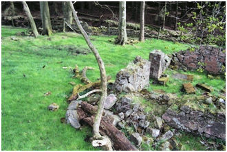 This walled enclosure sits eccentrically within an outer tree-planted enclosure bounded by a low dyke which contains traces of mortar. The outer enclosure is 18.5m N/S by 14.7m W/E with a curved south-eastern corner. The western side is formed from the current field boundary. It has an access point, 1.3m wide, in its northern side, that being the direction of approach from Bonnyhill Farm.