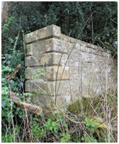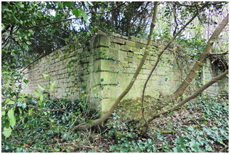 The central doorway on the north-west side is of the conventional type, having backset margins and measures 0.91m between the stubs (which are 0.15m broad and 0.05m deep). Two hinge pivots are set into the south side, with two rectangular sockets mid-way up the opposite side. The south-east wall was lower than the others, being six courses or 0.55m high. The taller walls to either side return onto this face for 0.45m ending in channelled terminals. These upper courses continue the V-jointing to the corners. The central doorway in this side has been almost completely destroyed by a large tree growing in it, but the remains of an internal return can be seen. Presumably the low section of the wall was surmounted by an iron railing and was intended to be seen from the church.