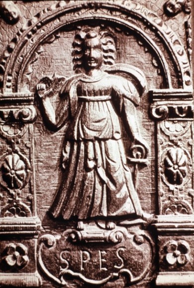 Inside the building, the roof was open, with rafters of an oak shade. The windows, for the most part, were filled with painted Scriptural emblems and along the nave were various Biblical selections of duty and promise. In the chancel a set of five carved oak panels were set in the back of a wooden seat. They measured an average of 1ft 3in by 9in; and were carved in relief with religious scenes and allegorical figures, all set within decorative architectural frames. One contained a representation of the Annunciation and another of the Circumcision, while a third depicted the figure of Hope. The remaining two had unnamed allegorical figures which were somewhat different in feeling from the other three subjects. The work was of a style which spread to England and Scotland from the Low Countries in the 16th and 17th centuries (RCAHMS 1963, 402) and they were probably acquired as antiques by the Countess. This was probably the two Bishop’s chairs made from wood from Oberammergau mentioned later.