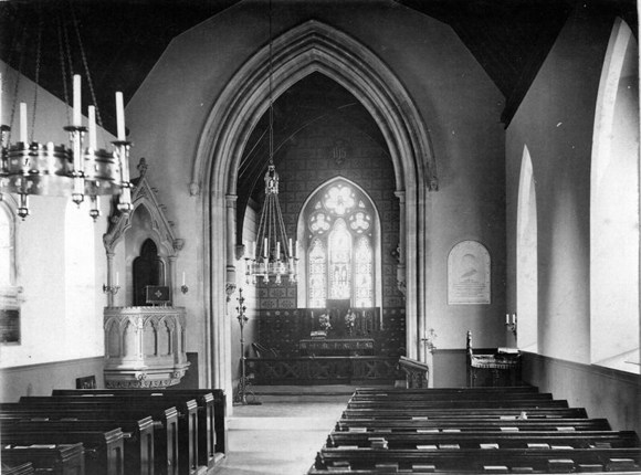 The altar, altar screen and reading desk, were of solid oak, while the pulpit was entirely hewn from one block of stone. Behind the altar a large Gothic window was filled with stained (painted) glass. On either side of the window were the commandments of the Decalogue, painted in the old English style; and around the chancel arch was a scroll, in similar characters, lettered in bronze, with the words; “Let us come boldly to the throne of grace, that we may obtain mercy to help in the time of need.” The organ and choir occupied a place to the west end of the building, and two stained glass windows adorned other parts of the chapel (Alloa Advertiser 27 June 1863, 2).
