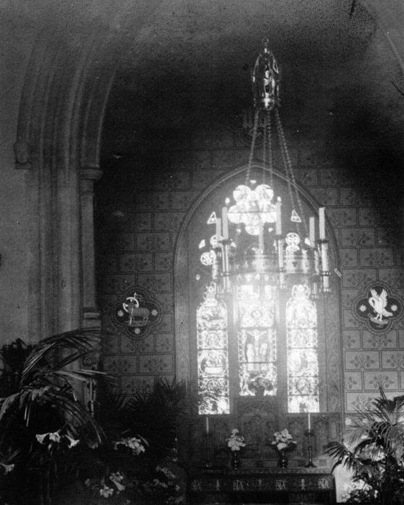 Claud Hamilton and his wife, Henrietta, bought the part of Dunmore estate containing the church in 1892 and keenly promoted its interests. One of their daughters married Rev W A Carroll, vicar of Bickley in Kent, at St Andrew’s Church, and he occasionally performed his duties at Dunmore. When Claud died in 1903 Mrs Hamilton decided to place a stained glass window in the chancel in his memory, replacing the original painted one. The three-light window was dedicated by Rev. Walter Scott of Dunmore that July. The artists were Bartison & Grylle, Newman Street, London. It represented the Adoration of Christ in glory. The principal figure in the central light was that of Christ arrayed in robes as the High Priest, reigning from the Cross, no longer the cross of suffering. Beneath were figures of the archangels, Michael, Raphael, and Gabriel, with their well-known emblems – “To thee all angels cry aloud; the Heavens and all the powers therein.” On the left or north light the glorious company of the Apostles was depicted above a panel containing the noble army of martyrs, and in the corresponding space in the south light the goodly fellowship of the Prophets and a representation of the Holy Church throughout all of the world, united in their praise of Christ. In the trefoils above these lights were angels swinging censors, and in the cinquefoil at the head of the window angels adoring the Lamb of God, while the four emblems of the Evangelists were represented at the head of the two side lights and at the foot of the Cross itself.