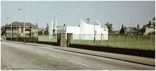 1963: New building designed by Coia (of Gillespie, Kidd & Coia) at the south-west corner of Dean Road and Linlithgow Road. The triangular plan had its apex towards the road junction. The congregation occupied this end, facing the broad end of the building on the west. The building had a flat roof and white rendered concertina in Le Corbusier tradition.
